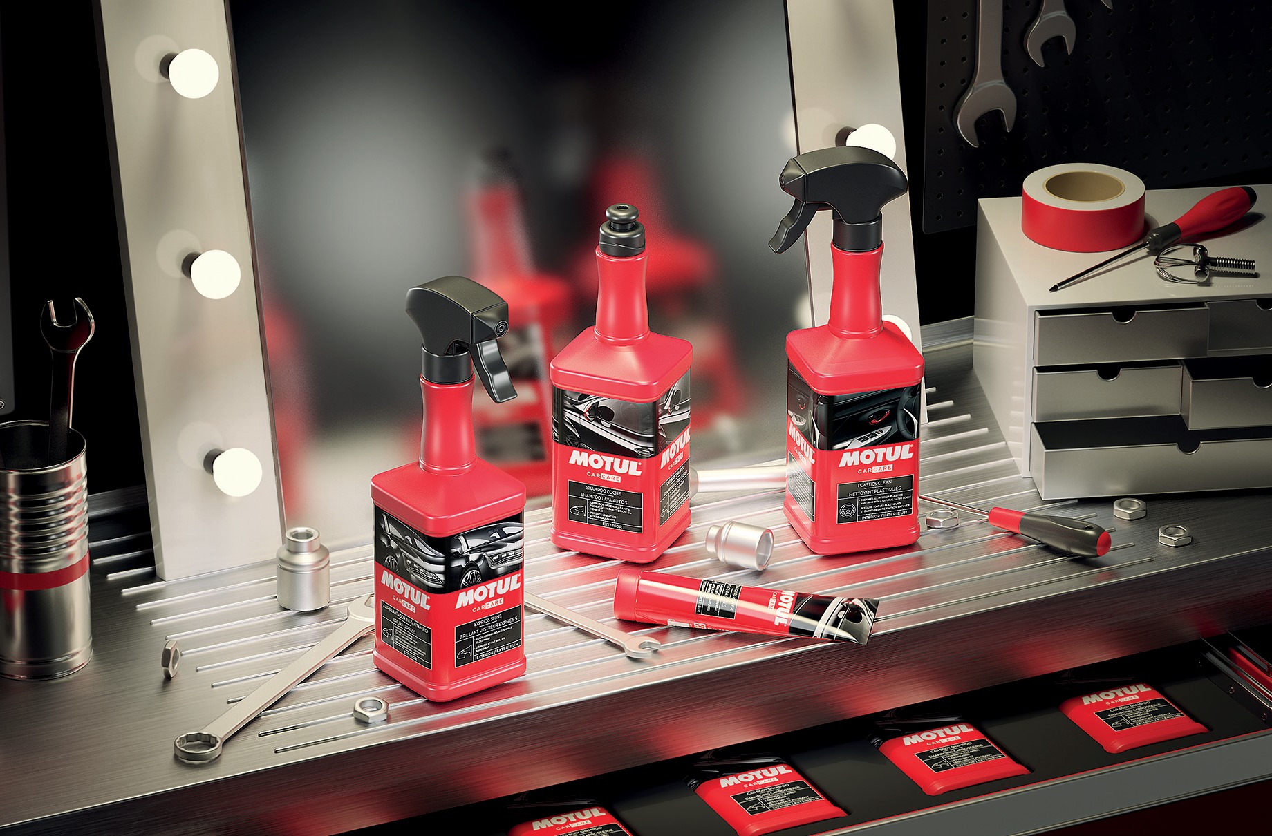 Motul har et bredt sortiment af forskellige plejeprodukter. Alt fra ruderens, fælgrens samt indvendig pleje.